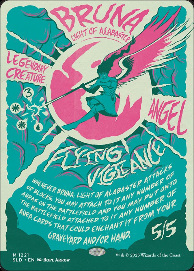Whenever Bruna attacks or blocks, you may attach to it any number of Auras on the battlefield and you may put onto the battlefield attached to it any number of Aura cards that could enchant it from your graveyard and/or hand.