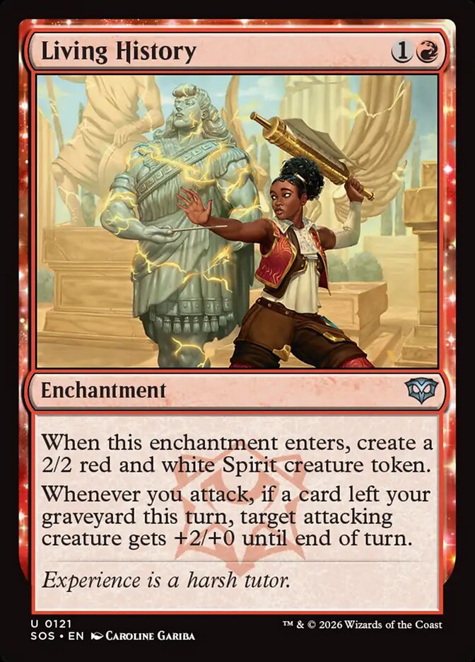 When this enchantment enters, create a 2/2 red and white Spirit creature token.