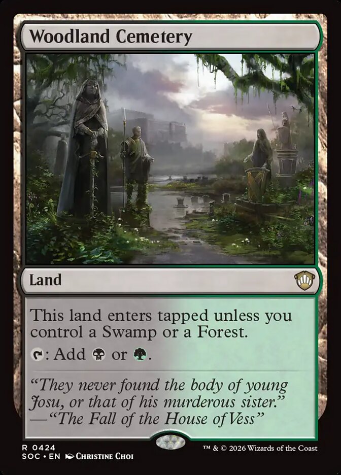 This land enters tapped unless you control a Swamp or a Forest.: Add or .