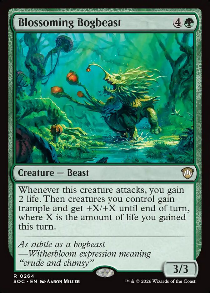 Whenever this creature attacks, you gain 2 life. Then creatures you control gain trample and get +X/+X until end of turn, where X is the amount of life you gained this turn.
