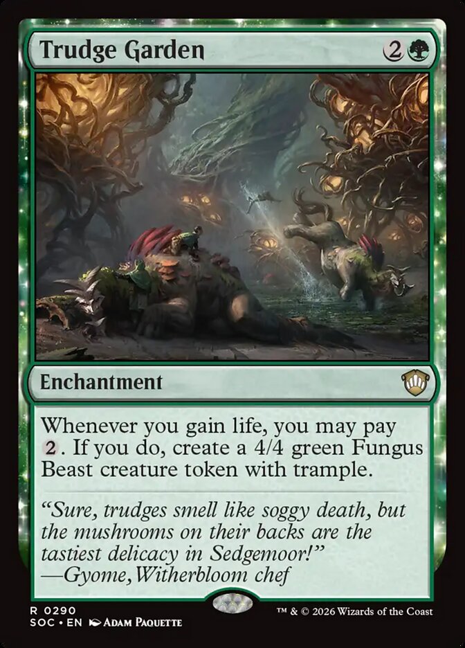 Whenever you gain life, you may pay . If you do, create a 4/4 green Fungus Beast creature token with trample.