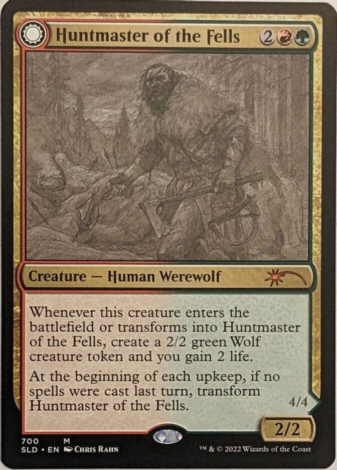 Whenever this creature enters or transforms into Huntmaster of the Fells, create a 2/2 green Wolf creature token and you gain 2 life.