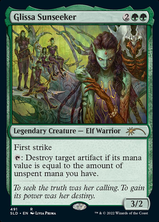 First strike: Destroy target artifact if its mana value is equal to the amount of unspent mana you have.