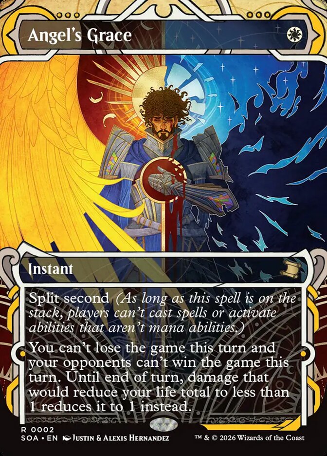 You can't lose the game this turn and your opponents can't win the game this turn. Until end of turn, damage that would reduce your life total to less than 1 reduces it to 1 instead.