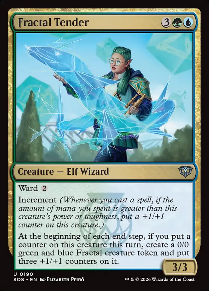 At the beginning of each end step, if you put a counter on this creature this turn, create a 0/0 green and blue Fractal creature token and put three +1/+1 counters on it.